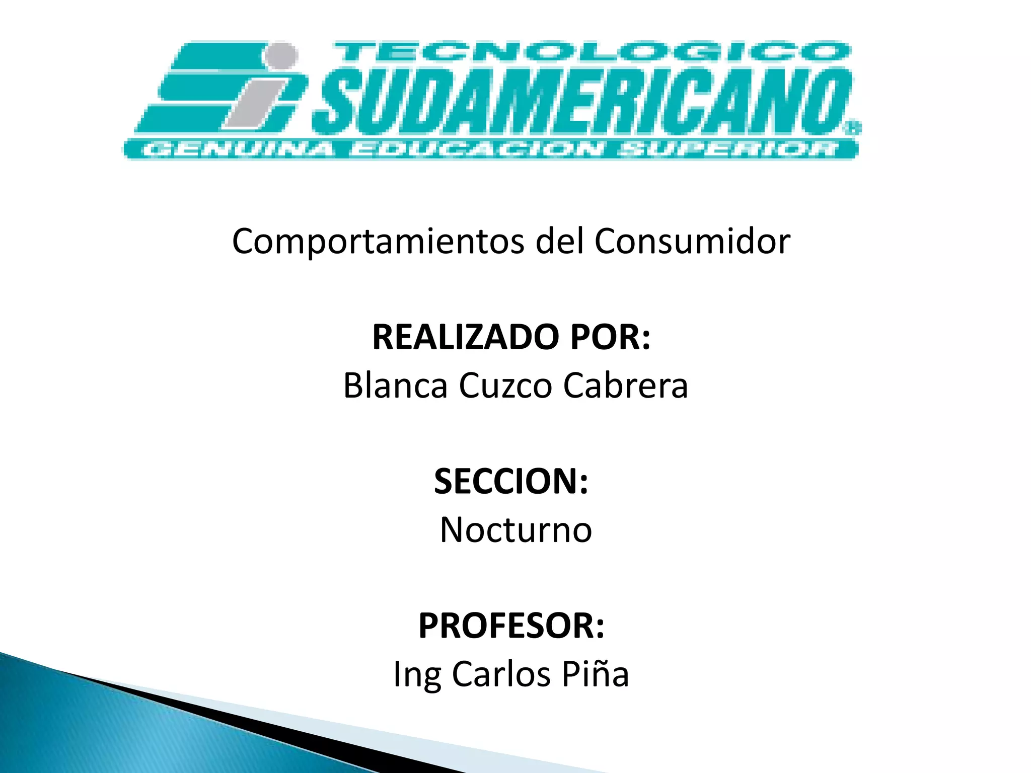 El documento describe un cuadro que identifica los actores del consumidor, incluyendo al consumidor, la competencia, los intermediarios y la publicidad. Se realizó para un curso nocturno sobre comportamiento del consumidor impartido por el profesor IngCarlos Piña.