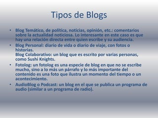 Este documento describe diferentes tipos de blogs, como blogs temáticos, personales, colaborativos, fotologs y podcasts. También describe características comunes de los blogs como comentarios, enlaces y métricas para medir el éxito de un blog como número de visitas y participación de usuarios. Además, explica cómo crear blogs de calidad y herramientas populares para crear blogs como WordPress, Drupal y FlashBlog.