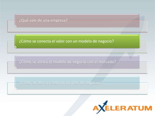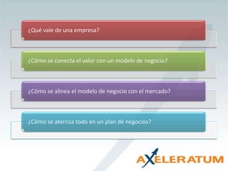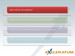 El documento describe un método para crear un plan de negocio a través de la definición del modelo de negocio. Explica que los individuos generan valor a través de sus proyectos cuando este valor satisface una necesidad de otros, creando así un mercado. Si el mercado está dispuesto a pagar por este valor, existe un modelo de negocio. Lo único necesario para capitalizar este modelo es describir el proceso en un plan de negocios que permita entregar este valor repetidamente.