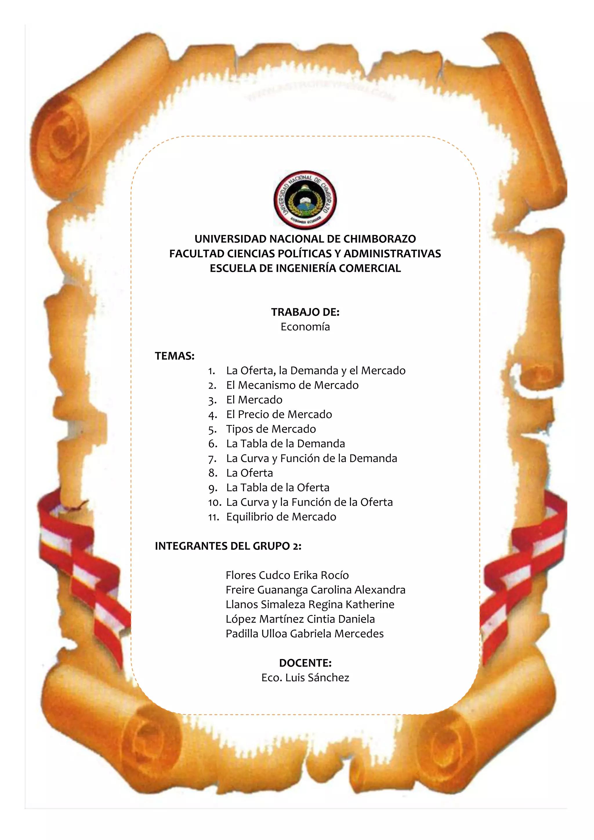 Este documento presenta un resumen de los conceptos fundamentales de la economía de mercado como la oferta, la demanda, el equilibrio de mercado, los tipos de mercado, las curvas y funciones de oferta y demanda, y el precio de mercado. El documento fue escrito por estudiantes de la Facultad de Ciencias Políticas y Administrativas de la Universidad Nacional de Chimborazo para un trabajo sobre economía.