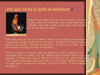 El documento presenta varias preguntas sobre curiosidades naturales y sus respuestas. Explica que los gallos cantan al amanecer para demostrar su dominio en el gallinero. También señala que las vacas contribuyen con el 28% de las emisiones humanas de metano debido a su flatulencia, y que estornudamos para expulsar partículas que irritan nuestras fosas nasales. Además, explica que el hielo se pega a la lengua debido a la atracción entre los electrones sueltos en nuestras bocas