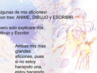 El documento describe las aficiones de dibujo y escritura de la persona. El dibujo fue inspirado por alguien y aprendido a través de la práctica, requiriendo materiales. La escritura surgió en la preparatoria, donde cada libreta tenía una historia comenzada. El dibujo digital es una habilidad nueva usando el programa Paint Shop Pro y la técnica de píxeles o a pulso.