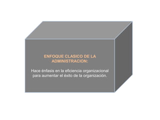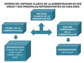 El documento divide el enfoque clásico de la administración en dos áreas: el análisis comprensivo de la administración, representado por Henry Fayol, y la teoría de la administración científica, representada por Taylor, Gilbreth y Gantt. Se describen los principales principios de cada enfoque, incluyendo el énfasis de Taylor en la eficiencia a través de estudios científicos de tiempos y movimientos, y la visión integral de Fayol de la organización y los procesos administrativos.