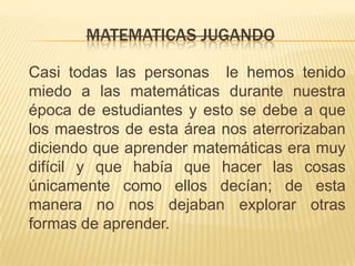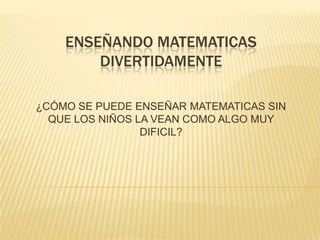 Este documento discute formas de enseñar matemáticas de manera divertida e interactiva para que los niños no la vean como algo difícil. Sugieren usar juegos, actividades no académicas y tecnología para enseñar conceptos matemáticos básicos como conjuntos y tablas de multiplicar de una manera lúdica y didáctica en lugar de forzar a los niños a aprender de sólo una manera.