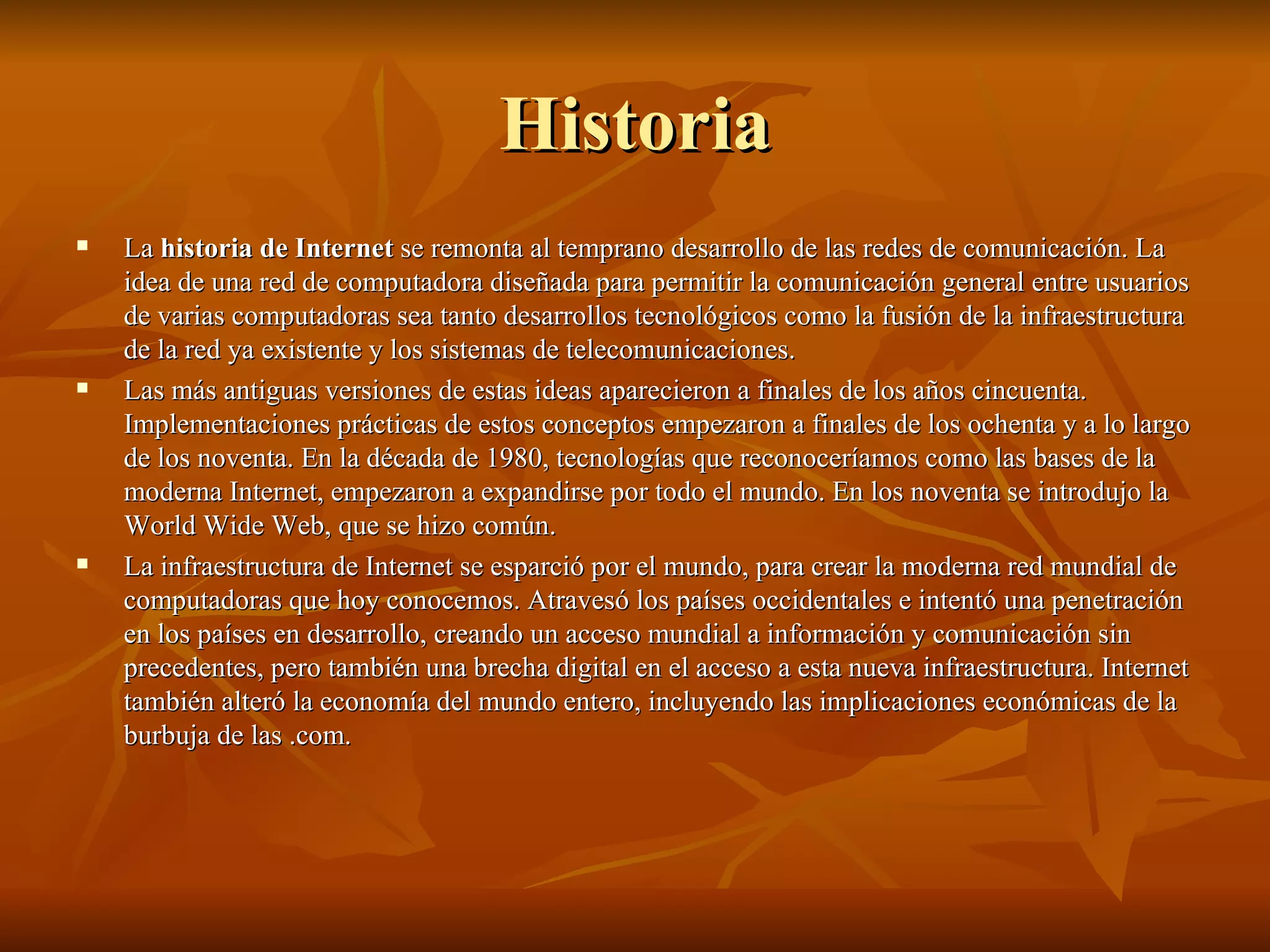 El documento describe la historia y evolución de Internet. Se remonta a sus orígenes en las décadas de 1960 y 1970 como una red militar y académica llamada ARPANET en Estados Unidos. En los años 1980 y 1990, la tecnología se expandió a nivel mundial y surgieron protocolos como TCP/IP que permitieron la interconexión de redes. En la actualidad, Internet permite el acceso mundial a información y comunicaciones sin precedentes, aunque también ha creado brechas digitales.