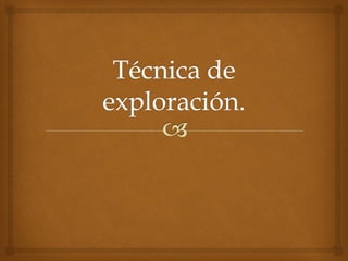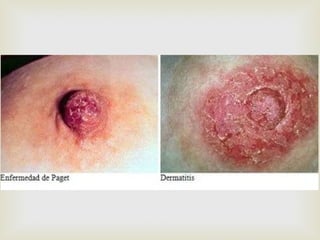 Este documento describe la anatomía y exploración de las mamas, así como patologías comunes. Detalla la localización, estructura y técnica de exploración mamaria, incluyendo diferentes posiciones de la paciente. Explica características de masas, secreciones anormales, enfermedad de Paget, lesiones granulomatosas y principales patologías mamarias.