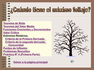 Este documento presenta los conceptos fundamentales del cálculo diferencial como el teorema de Rolle, funciones crecientes y decrecientes, valores críticos, extremos relativos, concavidad y puntos de inflexión. Además, incluye criterios de evaluación y ejemplos resueltos para aplicar estos conceptos en el análisis y trazado de gráficas de funciones.
