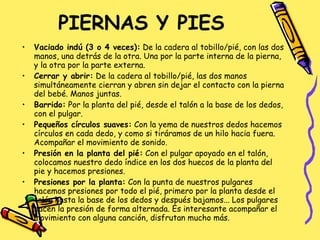 El documento proporciona instrucciones detalladas para realizar un masaje infantil completo, incluyendo movimientos para piernas, abdomen, pecho, brazos, cara, espalda y bibliografía recomendada. Describe más de 20 técnicas como vaciado indú, noria, sol y luna, abrir un libro y vaivén, con indicaciones sobre cómo aplicar suave presión y realizar círculos rítmicos para relajar y estimular al bebé.