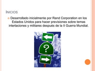 El Método Delphi fue desarrollado originalmente por la Rand Corporation para hacer previsiones después de la Segunda Guerra Mundial. Su objetivo es obtener información cualitativa pero precisa sobre el futuro mediante iteraciones anónimas y retroalimentación controlada para alcanzar un consenso del grupo de forma estadística. Consiste en dos etapas donde los expertos primero estiman eventos futuros de forma individual y luego reconsideran sus respuestas a la luz de los resultados del grupo.