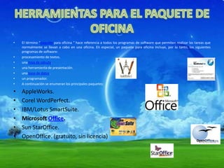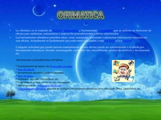 La ofimática se refiere al conjunto de técnicas y herramientas informáticas utilizadas en las oficinas para optimizar y automatizar tareas como el procesamiento de textos, hojas de cálculo, presentaciones multimedia, bases de datos y correo electrónico. Los paquetes ofimáticos más comunes incluyen Microsoft Office, OpenOffice y Corel WordPerfect, y contienen programas de procesamiento de textos, hojas de cálculo, presentaciones y bases de datos.