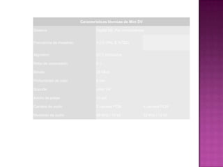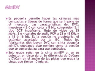 El documento proporciona información sobre diferentes formatos de video analógicos y digitales como MiniDV, Video8, Hi8 y Digital8. Explica que MiniDV se ha mantenido como el formato dominante en el sector doméstico debido a su excelente calidad digital y pequeño tamaño de casete. También describe brevemente los formatos de video basados en disco duro y DVD.