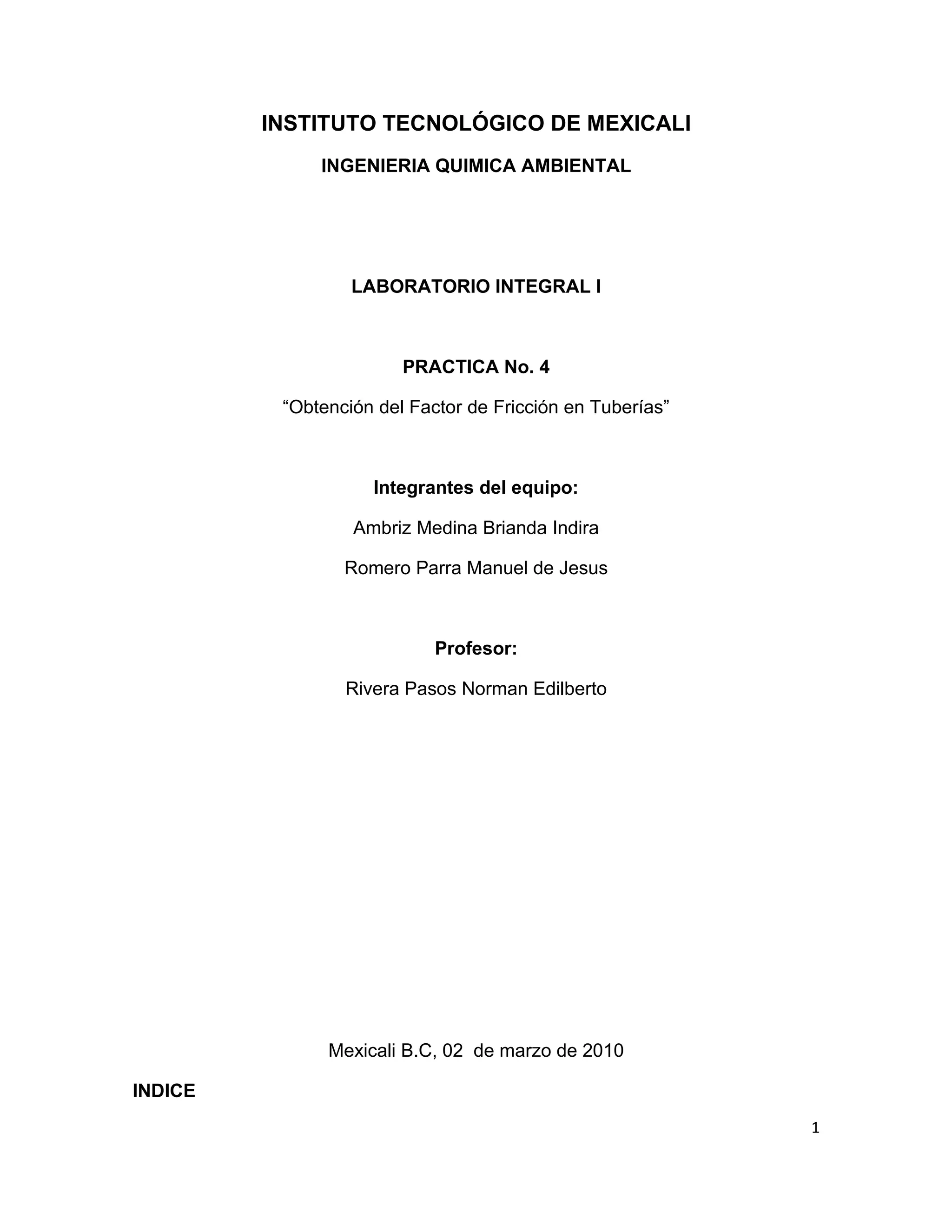 Esta práctica de laboratorio tuvo como objetivo determinar el factor de fricción en tuberías de diferentes diámetros y materiales. Se realizaron mediciones de caudal y presión en tuberías de galvanizado, cobre y PVC de 16-17 mm. Los datos obtenidos se utilizaron para calcular el número de Reynolds, la fricción teórica y experimental. Se graficaron los resultados para comparar el comportamiento de cada tubería.