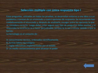 El documento describe cuatro tipos de preguntas de selección múltiple utilizadas en pruebas de evaluación: 1) Selección múltiple con única respuesta, donde se elige una opción correcta; 2) Selección múltiple con múltiples respuestas, con varias opciones correctas; 3) Selección múltiple con afirmaciones y justificaciones para evaluar veracidad; 4) Selección múltiple con una situación y opciones de respuesta, utilizada en matemáticas y lenguaje.