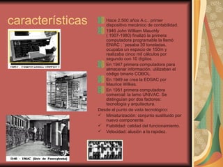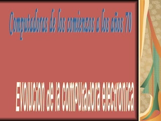 El documento resume la evolución de las computadoras desde sus inicios en los años 40 hasta los años 70. En la primera generación (1951-1955) las computadoras usaban válvulas de vacío y relés electromagnéticos. En la segunda generación (1955-1964) los transistores reemplazaron las válvulas y las máquinas se hicieron más pequeñas y rápidas. En la tercera generación (1964-1970) se introdujeron los circuitos integrados y microcircuitos, haciendo las computadoras aún más pequeñas y rápidas.
