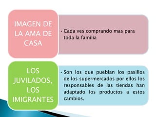 El documento habla sobre los cambios en los supermercados debido a cambios demográficos. Los supermercados se han adaptado al nuevo perfil del consumidor ofreciendo productos que se ajustan más a sus necesidades y costumbres. Esto incluye una amplia gama de productos variados de otros países para que los inmigrantes se sientan más cerca de casa donde quiera que estén.