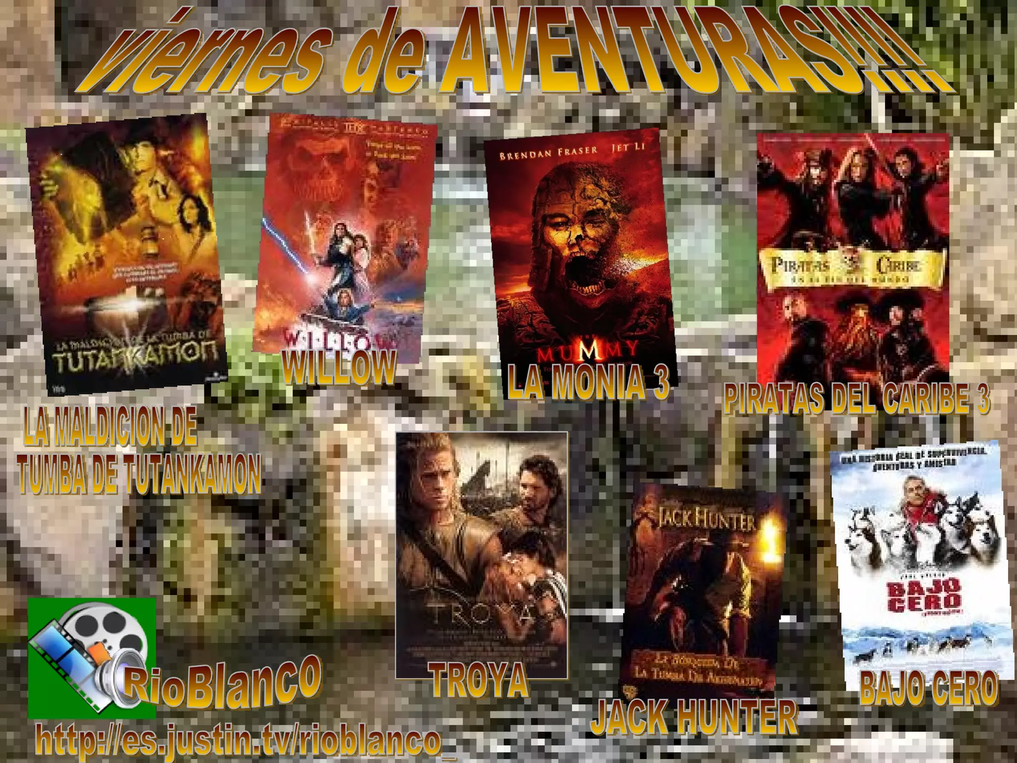 El documento lista varias películas y programas de televisión para ver un viernes, incluyendo RioBlanco, Willow, Troya, Tumba de Tutankamón, La Maldición de la Momia 3, Piratas del Caribe 3, Bajo Cero y Jack Hunter.