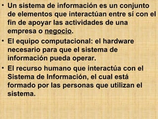 Un sistema de información consta de elementos que interactúan para apoyar las actividades de un negocio, incluyendo el hardware, los usuarios, y las funciones de entrada, almacenamiento, procesamiento y salida de datos. La información se introduce a través de dispositivos como teclados y escáneres, se almacena en archivos en discos duros, se procesa mediante cálculos, y se emite a través de impresoras u otros sistemas.