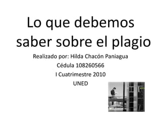 Este documento explica qué es el plagio y cómo evitarlo. Define el plagio como tomar las palabras o ideas de otros sin darles crédito. Explica que cuando se cita u ofrece un resumen de la información de otra fuente, se debe reconocer la fuente original. También proporciona instrucciones sobre cómo citar correctamente según los estilos APA y MLA y estrategias para parafrasear en lugar de copiar directamente y así evitar el plagio.