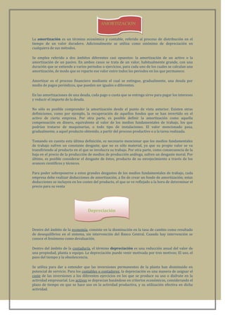 El documento habla sobre la amortización y depreciación de activos. La amortización es el proceso de distribuir el valor de un activo duradero a lo largo del tiempo mediante pagos periódicos. La depreciación reconoce la disminución del valor de un activo debido a su uso y envejecimiento. Existen varios métodos para calcular la depreciación como línea recta, suma de dígitos y reducción de saldos.
