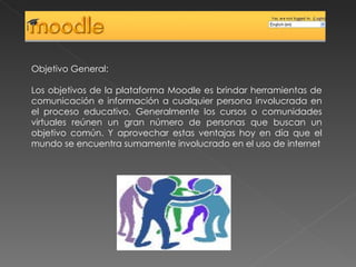 El documento describe la plataforma Moodle, un software de código abierto para crear cursos virtuales. Moodle permite a las instituciones educativas proporcionar material de cursos, actividades y comunicación entre estudiantes y profesores de forma remota. El documento explica que Moodle surgió en 1999 y ahora se usa en más de 146 países. También discute las ventajas de Moodle, como permitir que los estudiantes aprendan a su propio ritmo y desde cualquier lugar, así como algunas limitaciones técnicas.