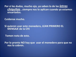 El documento habla sobre los nuevos medidores digitales de luz que están instalando en Veracruz, los cuales requerirán pagar por anticipado la luz cargando saldo como una tarjeta telefónica prepago. También advierte sobre un seguro de vida incluido en los recibos de la CFE que es difícil de cancelar y del cual no se proporciona información sobre el costo.
