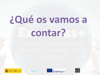 Este documento resume el programa Erasmus+ de la Unión Europea. Erasmus+ integra varios programas anteriores relacionados con la educación, formación, juventud y deporte en un solo programa para el período 2014-2020. El documento explica las diferentes acciones clave (KA) que incluye Erasmus+, los tipos de organizaciones e individuos que pueden participar, y los objetivos y actividades financiadas por cada acción clave.