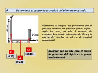 El documento describe cómo calcular el centro de gravedad de un alambre de longitud 40 cm y 0 grosor que se extiende desde (0,20) hasta (30,10). Dado que el alambre no tiene grosor, su centro de gravedad es simplemente su punto medio, que es (15,15).