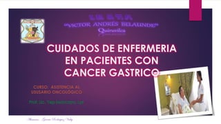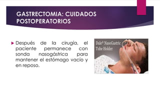Este documento describe los cuidados de enfermería para pacientes que han tenido una gastrectomía por cáncer gástrico. Incluye cuidados postoperatorios como el uso de una sonda nasogástrica, alimentación, cuidados de la herida quirúrgica y administración de medicamentos. También cubre posibles problemas y soluciones como lesiones en la nariz, obstrucción de la sonda, náuseas, vómitos y diarrea. El objetivo es ayudar a los pacientes a recuperarse de la cirugía y mejorar su