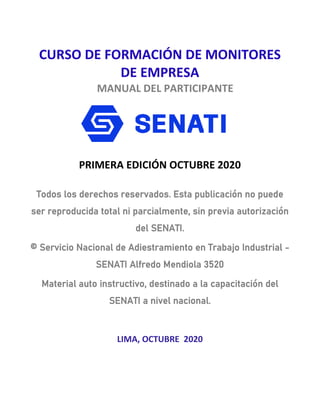 Este documento presenta el manual del participante para el curso de formación de monitores de empresa del SENATI. El manual contiene 4 unidades de aprendizaje que cubren temas como el origen y funciones del SENATI, la modalidad de aprendizaje dual, la gestión del aprendizaje en la empresa, la evaluación del aprendizaje, e instrumentos aplicados en el aprendizaje dual. El curso busca capacitar a los participantes para que puedan desempeñarse como monitores en empresas y supervisar el aprendizaje práctico de los apre