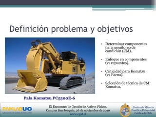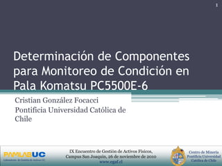 El documento describe un estudio para seleccionar los componentes críticos de una pala Komatsu PC5500E-6 que requieren monitoreo de condición. Se analizaron 31 componentes según criterios de indisponibilidad, costos y seguridad, identificando a la corona y al motor de giro como los más críticos. Se provee una descripción detallada de estos componentes, incluyendo sus modos de falla y la historia de fallas registrada.