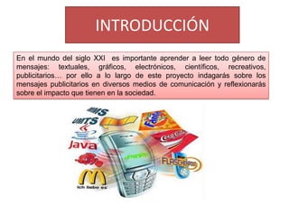 Este documento presenta un proyecto escolar sobre el impacto de la publicidad. El proyecto incluye tareas como investigar la influencia de la publicidad, analizar mensajes publicitarios en varios medios, y debatir los resultados de la investigación. El objetivo final es que los estudiantes participen en un debate para compartir lo que han aprendido sobre cómo afecta la publicidad a la gente.