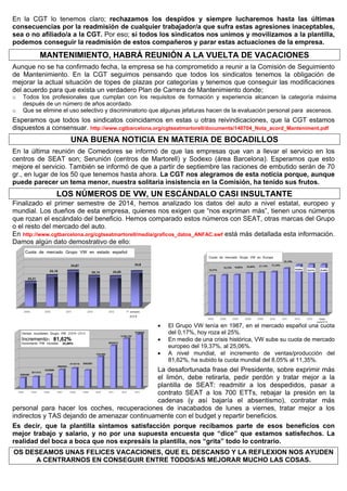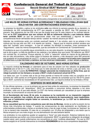 El documento resume las principales preocupaciones y reivindicaciones de la Confederación General del Trabajo de Cataluña (CGT) en la planta SEAT de Martorell. La CGT critica que solo se vayan a contratar a 200 de los 700 trabajadores eventuales y exige que todos pasen a ser empleados fijos de SEAT. También denuncia despidos injustificados y pide la readmisión de cinco empleados despedidos recientemente. Además, pide mejorar las condiciones laborales y repartir más equitativamente los beneficios entre