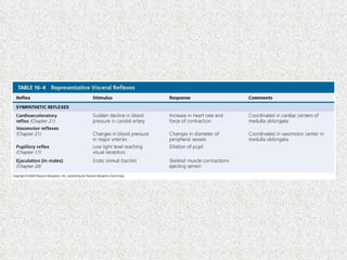 El documento describe los diferentes tipos de reflejos viscerales, incluyendo reflejos largos y cortos. Los reflejos largos involucran la médula espinal y el sistema nervioso autónomo, mientras que los reflejos cortos se limitan a los ganglios y controlan solo una parte del órgano. El sistema digestivo no tiene reflejos largos y su control y coordinación depende del sistema nervioso entérico, que contiene neuronas sensoriales, interneuronas y motoneuronas en las paredes del tracto digestivo.