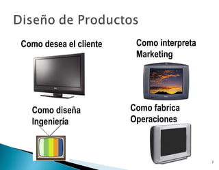 El documento describe el proceso de desarrollo de productos utilizando el enfoque de Calidad de la Función del Diseño (QFD). El proceso involucra a equipos multifuncionales que desarrollan cuatro "matrices" o "casas" para relacionar las necesidades de los clientes con las características del producto. Esto ayuda a crear un producto que satisfaga mejor las necesidades y preferencias de los clientes.
