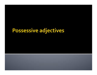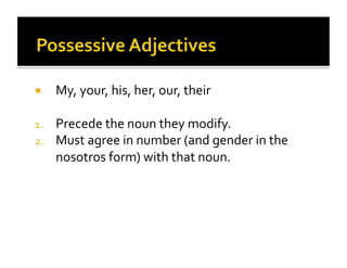Este documento proporciona instrucciones sobre el uso de pronombres posesivos en español como mi, tu, su, nuestro, y sus. Explica que los pronombres posesivos preceden al sustantivo que modifican y deben concordar en número y género con ese sustantivo. Proporciona ejemplos de cómo usar correctamente los pronombres posesivos en diferentes contextos.