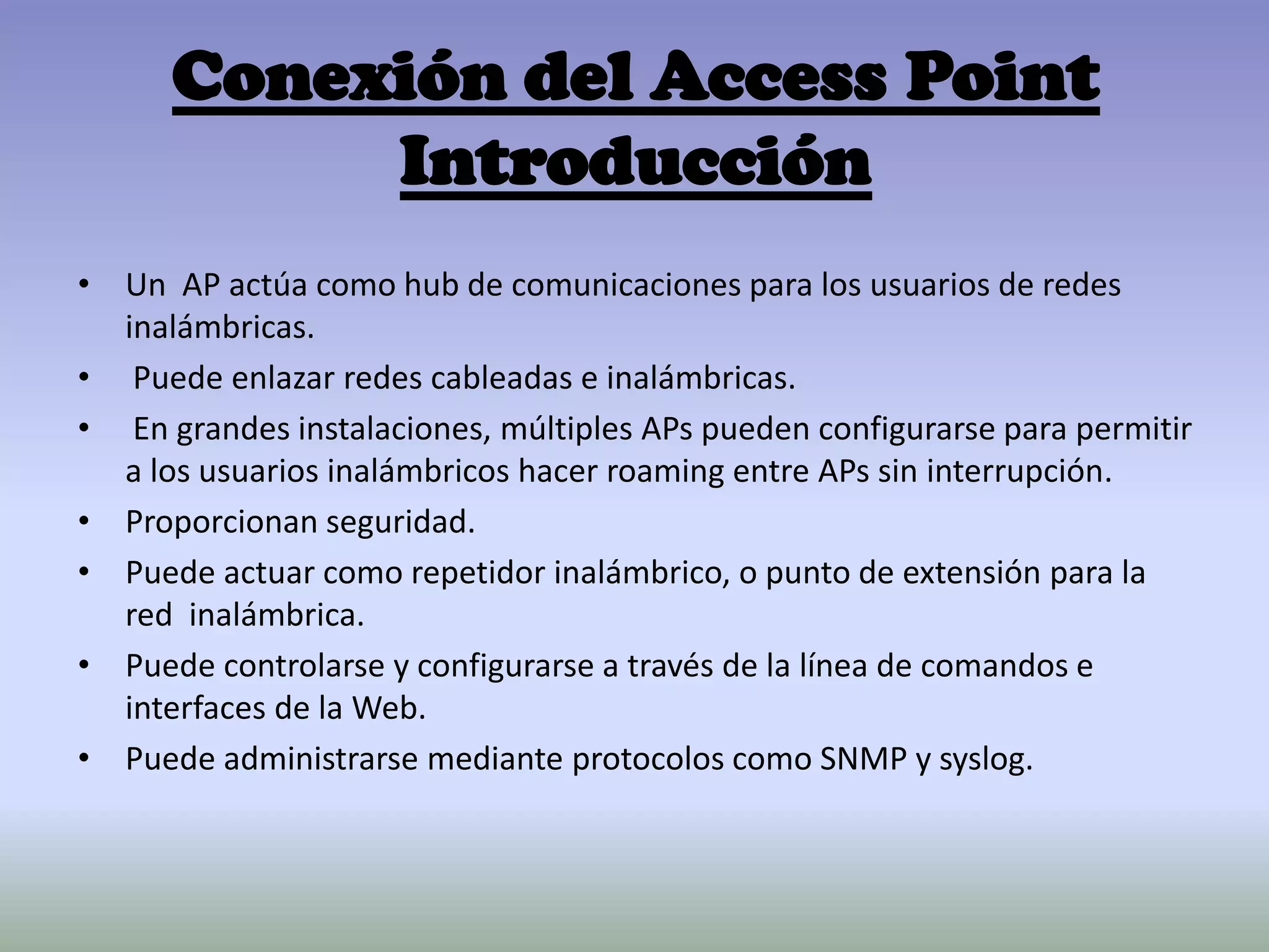 Este documento describe los access points y cómo conectarlos y configurarlos. Los access points actúan como puntos de acceso a la red inalámbrica y pueden conectarse a través de Ethernet, alimentación de línea o fuente de alimentación universal. Existen varios métodos para configurarlos inicialmente como la asignación de direcciones IP y SSID a través de una utilidad de configuración IP.