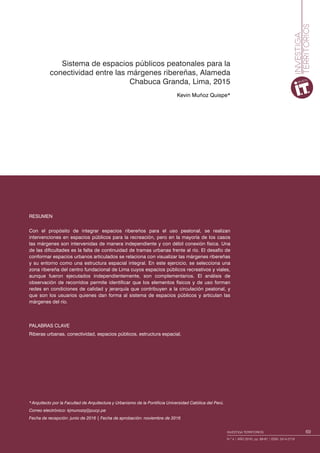 Este documento describe un sistema de espacios públicos peatonales para mejorar la conectividad entre las márgenes del río Rímac en Lima. Analiza las intervenciones históricas para conectar ambas márgenes y propone ver las márgenes como una estructura espacial integral. Estudia un área en el centro de Lima donde se implementaron espacios recreativos y viales de forma independiente pero complementaria. Mediante observaciones identifica redes formadas por elementos físicos y usos que contribuyen a la circulación peatonal y articulan