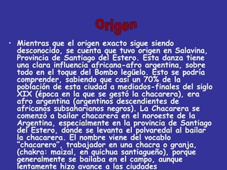 La chacarera es una danza folclórica originaria de la provincia de Santiago del Estero en el noroeste de Argentina. Tiene influencias africanas debido a la gran población afroargentina en Santiago del Estero en el siglo XIX. Se baila en parejas y consta de tres pasos básicos alternando entre los pies. Peteco Carabajal es un importante músico folclórico santiagueño conocido por fusionar la chacarera con otros estilos. Mercedes Sosa fue una legendaria cantante folclórica argentina reconocida intern
