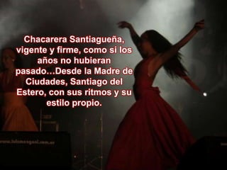 Este documento describe la chacarera santiagueña, una danza folclórica argentina que se baila en parejas de forma suelta e independiente. La chacarera representa la tradición y la historia de Santiago del Estero. También incluye la letra de una canción titulada "Ckeshu Sisa" que habla sobre el amor, la naturaleza, y la esperanza de la juventud.