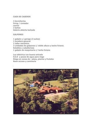La propiedad de 9 hectáreas incluye una casa principal con 5 dormitorios y 6 baños, una casa de huéspedes, dependencias de servicio, una casa para los caseros, y varios galpones. La propiedad también cuenta con una piscina, establos, caballerizas, y riego por aspersión. Se encuentra a 1200 metros de la Rambla de la Mansa.
