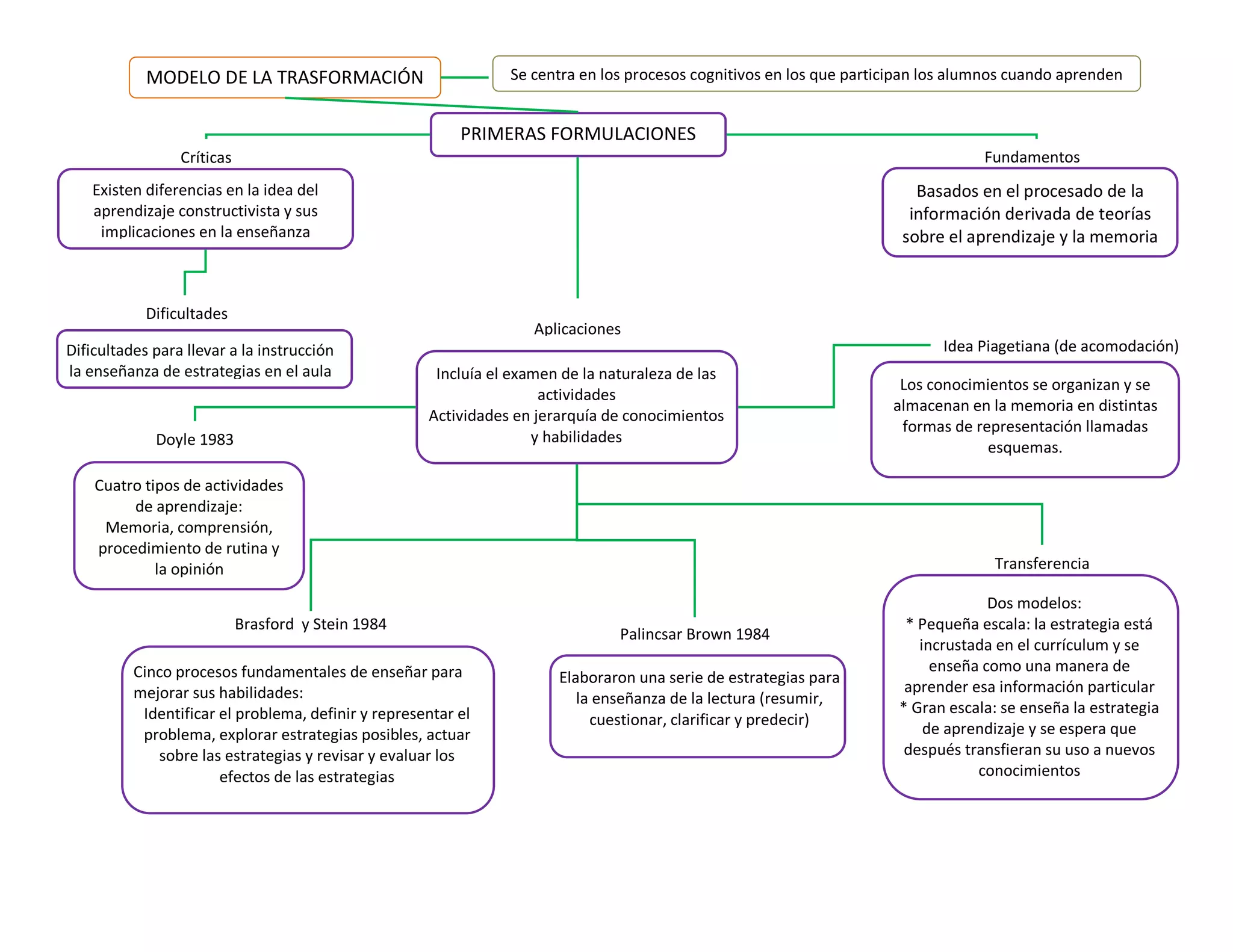 Este documento describe el modelo de la transformación, el cual se centra en los procesos cognitivos que participan los alumnos cuando aprenden. Explica las primeras formulaciones del modelo, incluyendo las críticas y fundamentos. También discute las dificultades en aplicar el modelo en la instrucción del aula y algunos ejemplos tempranos como el trabajo de Palincsar y Brown sobre estrategias de lectura.