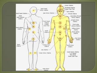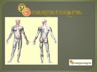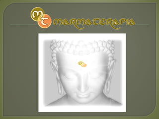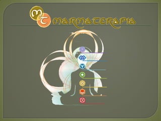Este documento describe los siete chakras principales, sus colores, elementos asociados, glándulas relacionadas y posibles desequilibrios. Explica que la Marmaterapia permite comprobar la interrelación entre los chakras y cómo el desequilibrio de uno puede afectar a los otros, permitiendo regularlos y restablecer el equilibrio.