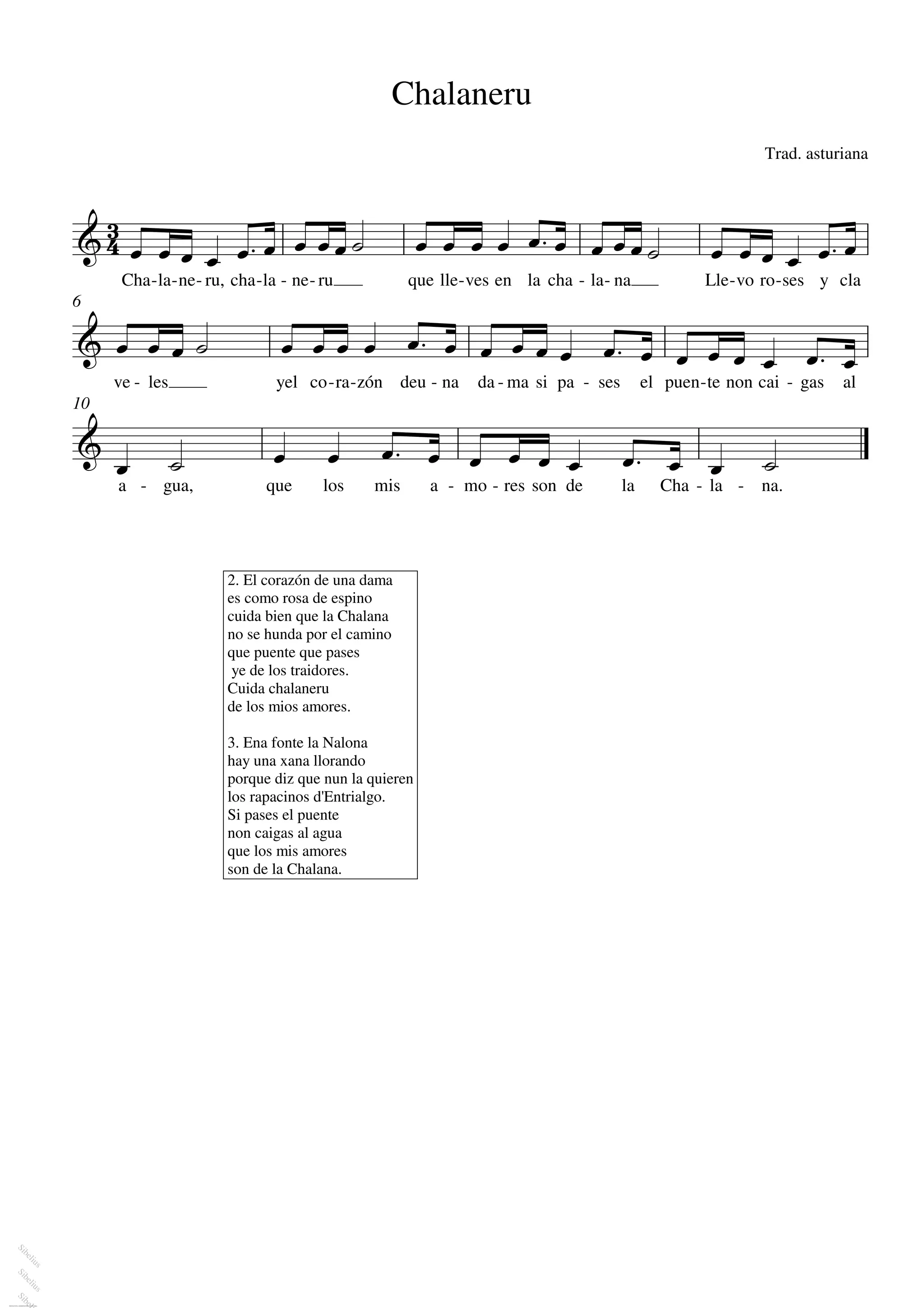 Este documento es la letra de una canción tradicional asturiana llamada "Chalaneru". La canción habla de una mujer que lleva rosas y claveles en su cesta mientras camina por un puente, advirtiendo que tenga cuidado para no caer al agua. También menciona que su corazón pertenece a alguien de Chalana y que debe cuidar el amor que siente por esa persona.