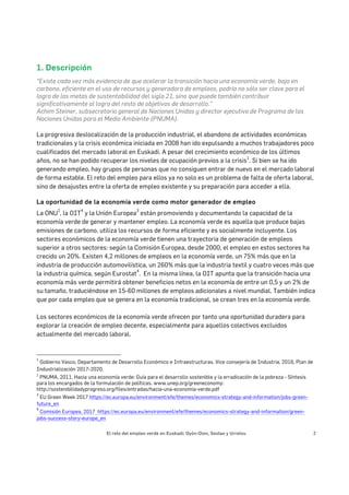 Este documento describe el reto de generar oportunidades de empleo de calidad en la economía verde para colectivos excluidos del mercado laboral en los municipios vascos de Oyón-Oion, Sestao y Urretxu. Señala que la economía verde ofrece oportunidades de empleo y que estos municipios tienen altas tasas de desempleo. Propone explorar iniciativas de formación adaptada a la demanda laboral y acompañamiento personalizado para aumentar la empleabilidad de las personas desempleadas a largo plazo