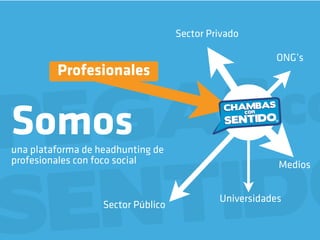Este documento presenta a Pegas Con Sentido, una plataforma de headhunting enfocada en conectar a profesionales con trabajo que tenga un propósito social. Explica que los profesionales buscan cada vez más trabajo con sentido y trascendencia. También describe los servicios que ofrece como búsqueda y selección de personal, y consultorías para ayudar a las organizaciones a atraer y retener talento alineado con sus valores. Finalmente, presenta brevemente al equipo de Pegas y algunas empresas que han trabajado con ellos.
