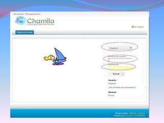 El documento proporciona información sobre Chamilo, una plataforma de aprendizaje en línea. Explica que los profesores pueden crear cursos, agregar materiales educativos, realizar evaluaciones, administrar foros de discusión y más. También describe cómo crear una cuenta en Chamilo y cómo los usuarios pueden iniciar sesión y crear sus propios cursos personalizados.