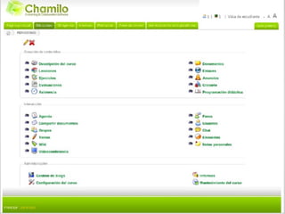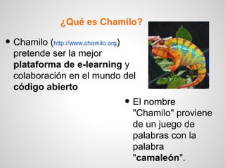 Este documento presenta Chamilo, un sistema de gestión de aprendizaje abierto (LMS) escrito en PHP y compatible con múltiples sistemas operativos y bases de datos. Chamilo es gratuito, fácil de usar e instalar, y ofrece características como foros, wikis, exámenes, certificados y seguimiento de cursos. Actualmente cuenta con más de 900 instalaciones, 65.000 cursos y 534.000 usuarios en 45 idiomas. El documento concluye proporcionando enlaces para descargar, documentación e inst