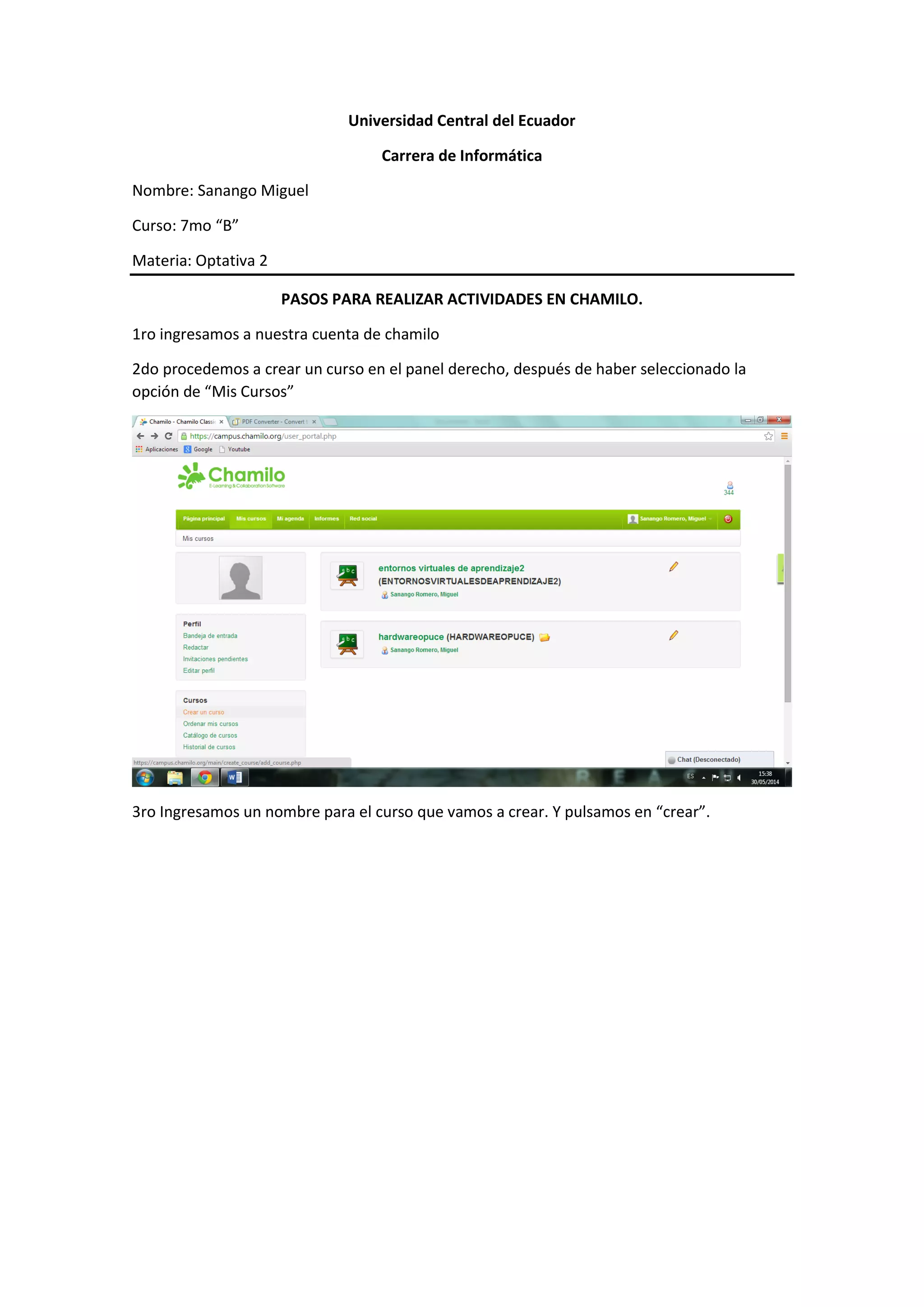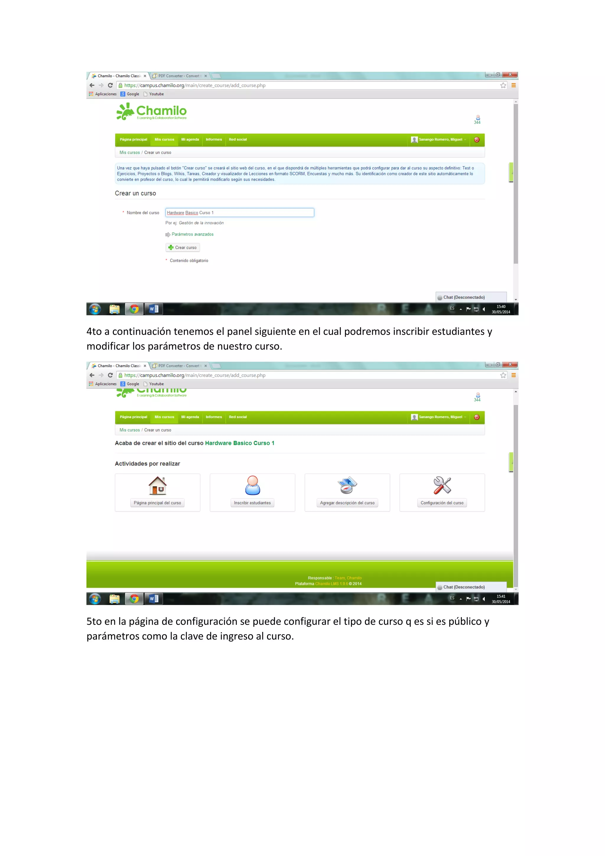 El documento proporciona instrucciones paso a paso para crear y administrar cursos, actividades y contenidos en la plataforma Chamilo. Explica cómo crear un curso, agregar estudiantes, configurar parámetros y contenidos. Luego detalla cómo crear tareas, foros, ejercicios, evaluaciones y wikis dentro de un curso en Chamilo.
