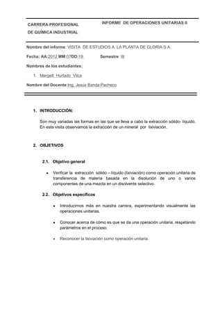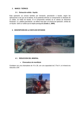 La visita estudiantil a la planta Gloria S.A. observó el proceso de extracción de cobre por lixiviación. El mineral era triturado y lixiviado con ácido sulfúrico, disolviendo el cobre. Luego se agregaba hierro para precipitar el cobre como cemento de cobre 85% puro. El proceso producía cobre catódico 99.9% puro mediante electrodeposición. Los estudiantes concluyeron que la reducción de tamaño aumenta el contacto mineral-disolvente y que la empresa debe mejorar la prote