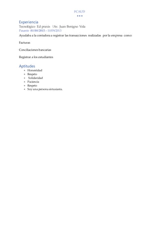 Chango Tipan Irma lucia busca un trabajo en contabilidad. Tiene 19 años y estudió contabilidad en el Tecnológico Ed praxis. Realizó una pasantía en una empresa donde ayudó a registrar transacciones como facturas y conciliaciones bancarias. Sus objetivos son obtener experiencia laboral, contribuir con sus conocimientos y ayudar a las empresas a prosperar.